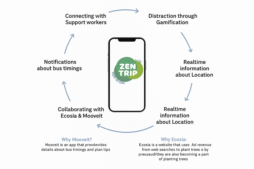ZenTrip is a service design concept designed in collaboration witn Mischelin Scotland Innovation parc Ltd. Zentrip helps neurodiverse individuals to feel more relaxed when using public transport, specifically busses, opening up sustainable mobility to a group of inviduals who currently struggle with transport.